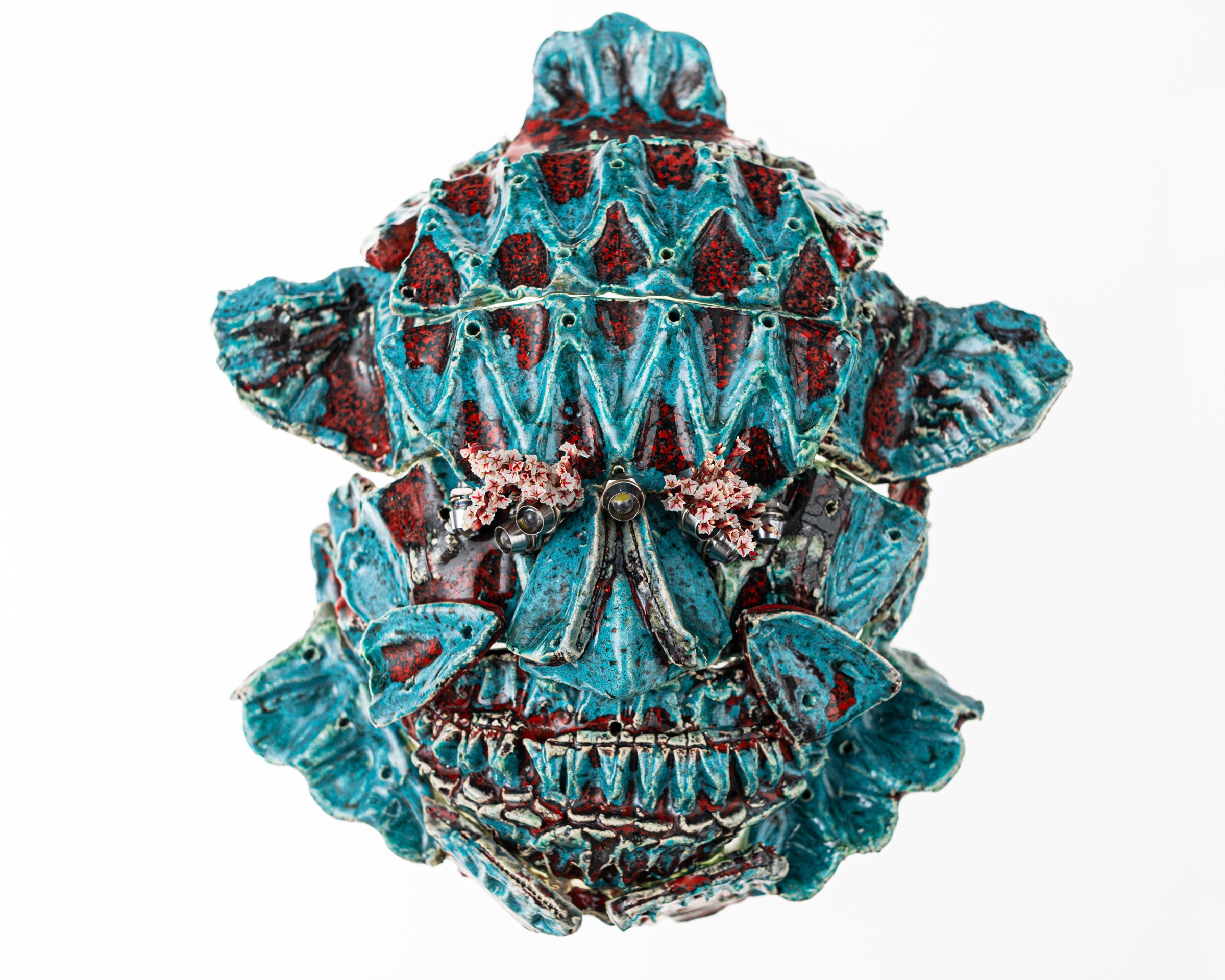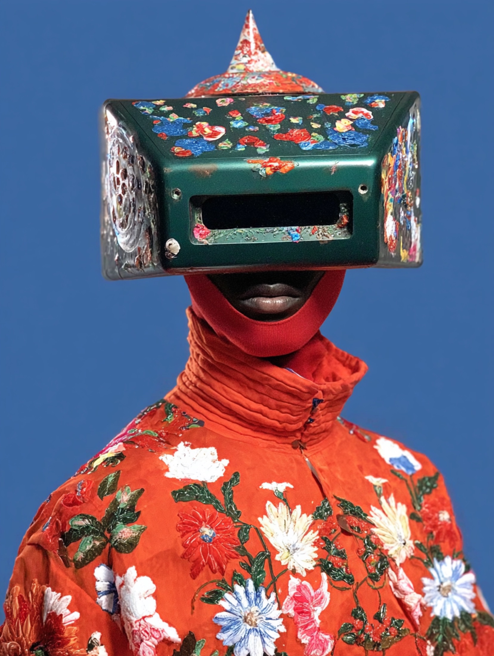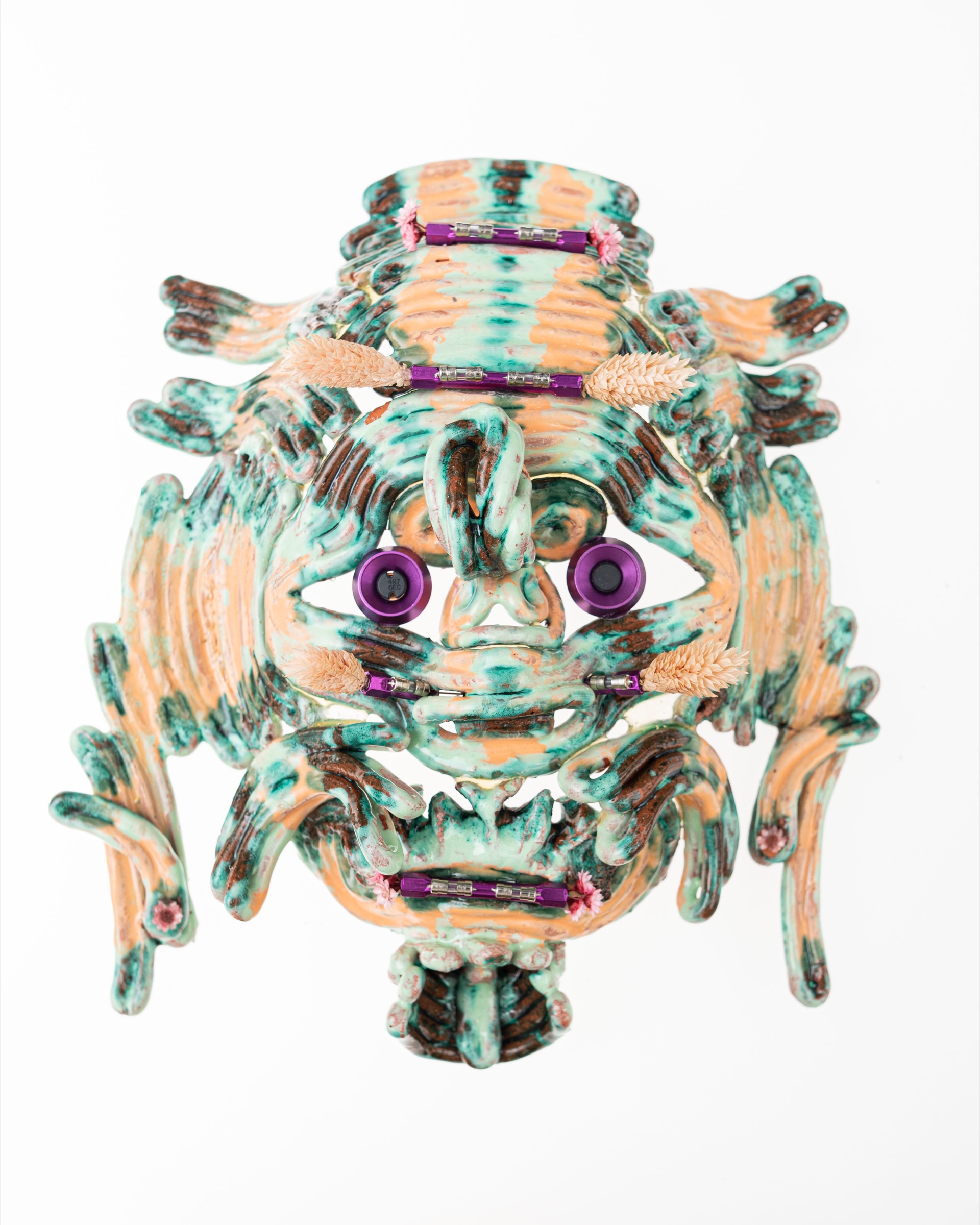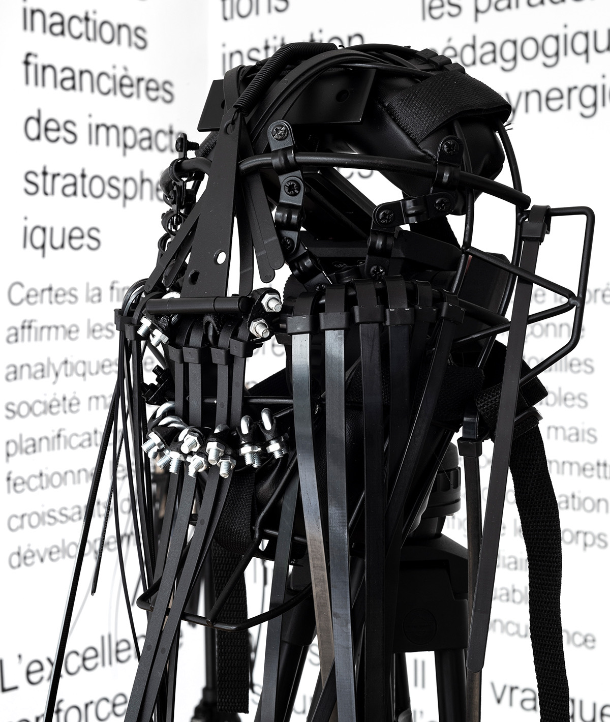 À travers ces figures masquées, l’œuvre transforme les dispositifs électroniques de vision, de calcul et de capture en objets de parure quasi rituels. Entre masque cérémoniel, interface et sculpture portable, ces formes interrogent la manière dont les technologies contemporaines redessinent le visage, non plus seulement comme lieu d’identité, mais comme surface d’inscription symbolique, de surveillance et de fiction.