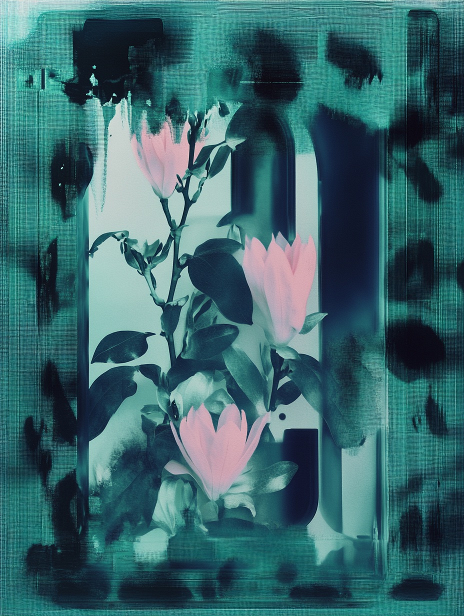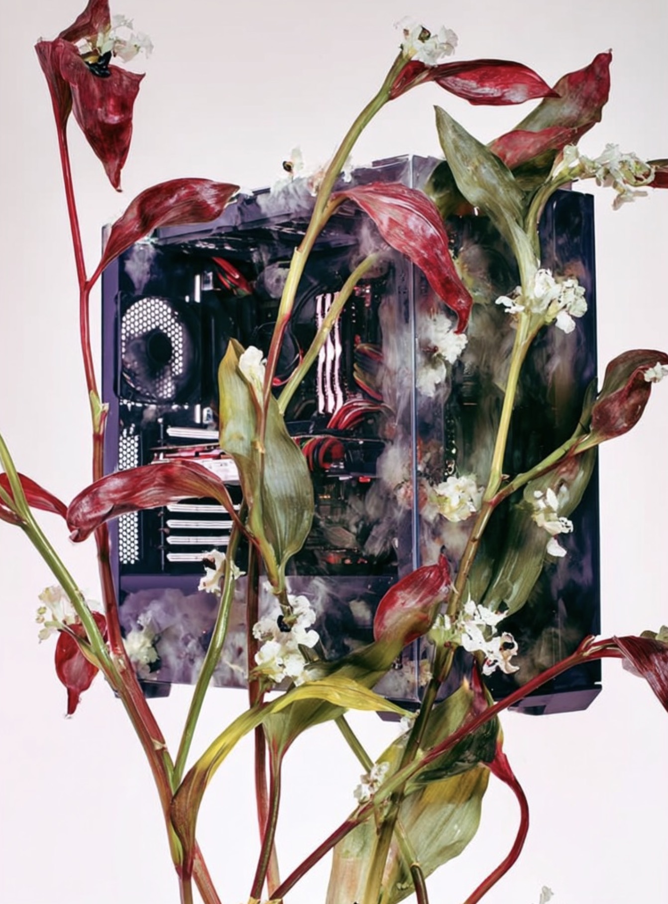 À l’heure où les data centers pourraient atteindre environ 945 TWh de consommation électrique annuelle d’ici 2030, et où le refroidissement peut représenter jusqu’à 40 % de l’énergie d’un centre de données, l’œuvre imagine un végétal qui n’évolue plus hors de l’infrastructure, mais à l’intérieur de ses flux thermiques, liquides et computationnels. Le recours au liquid cooling, dont les liquides peuvent transférer la chaleur jusqu’à 1 000 fois plus efficacement que l’air, devient ici une fiction de survie autant qu’un motif plastique. Face à un monde où l’on recense environ 391 000 espèces de plantes vasculaires, et dont une part croissante est menacée, cette image propose la figure spéculative d’une flore qui se maintient en mutant, en se créolisant avec la machine. Réalisée à partir de photographie augmentée, de composition numérique et de dépose pigmentaire par traceur hacké, elle donne forme à une écologie de seuil, où la fleur devient interface, la sève un circuit, et la croissance un protocole.