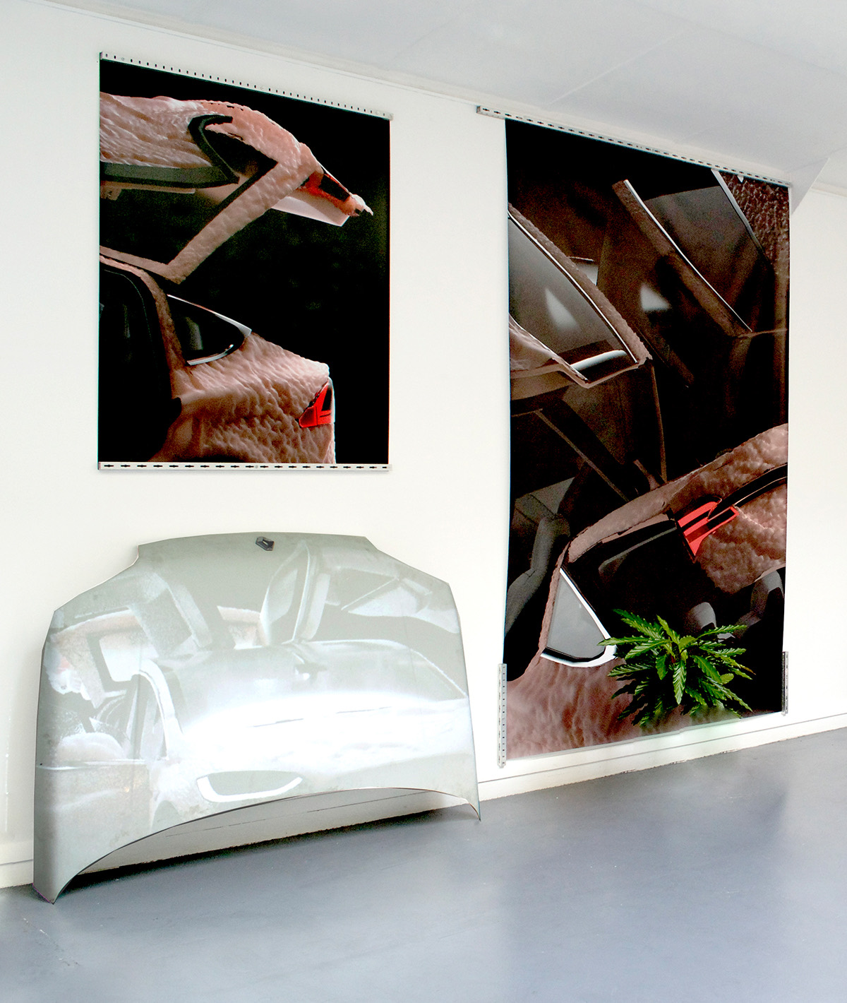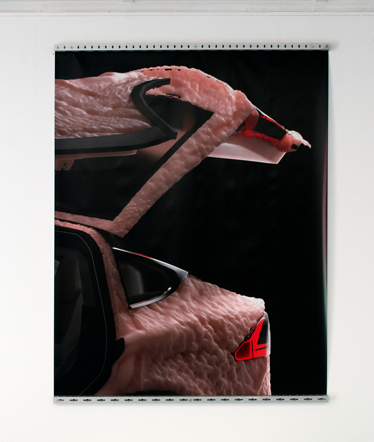Transmachinisme simule une nouvelle innovation Tesla, qui propose de choisir un revêtement de voiture augmenté avec de la peau humaine génétiquement modifiée. L’animation 3D est projetée en mapping sur la carrosserie, puis est imprimée sur bâche. Ce projet a été décliné en jeu vidéo permettant, comme on personnalise une voiture dans un jeu de course, de sélectionner la caractéristique corporelle appliquée à la machine (couleur et texture de peau).