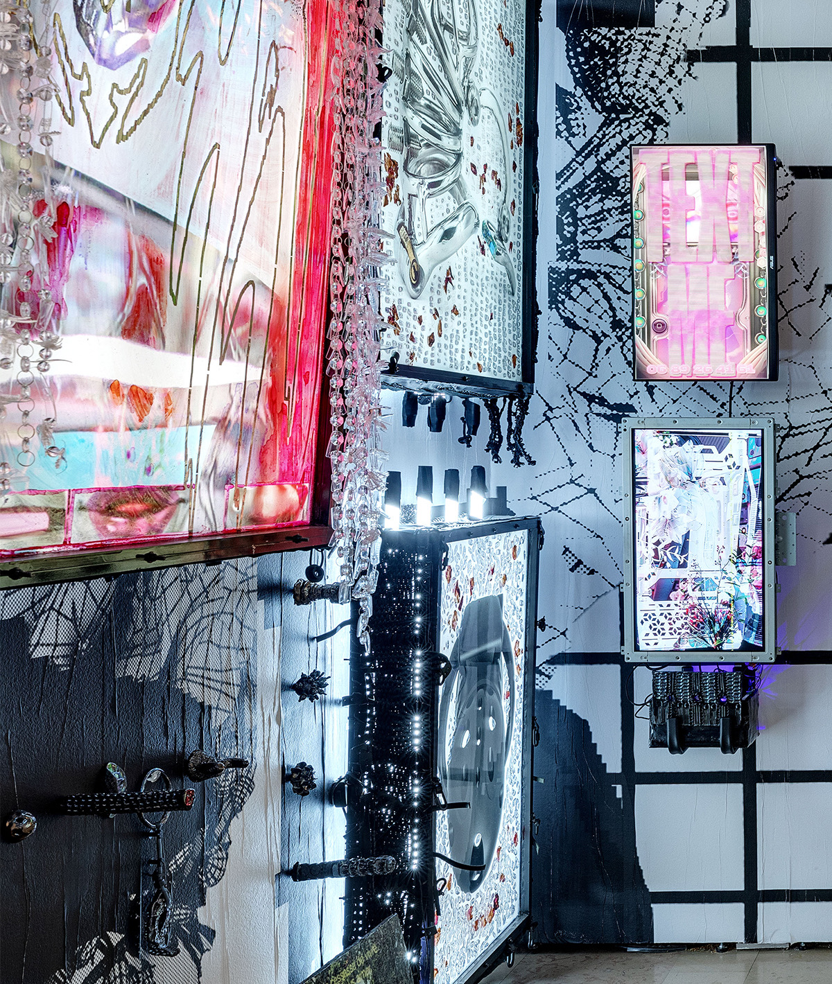 Cette installation, présentée au Salon de Montrouge à l’occasion de sa 65e édition, s’inscrit dans le prolongement de Il faudrait que je cessasse de vivre pour cesser de vous aimer et se pense comme une cartographie des mutations du désir érotique et du Néoporno. Elle observe l’essor des sextoys robotisés, ainsi que l’érotisation non plus de la machine anthropomorphe mais de formes mécaniques nous éloignant au maximum d’une apparence humaine. L’installation mobilise également une intelligence artificielle capable d’entrer en discussion avec le visiteur par SMS et de lui répondre par un message singulier associé à une composition appelée « nudes ».