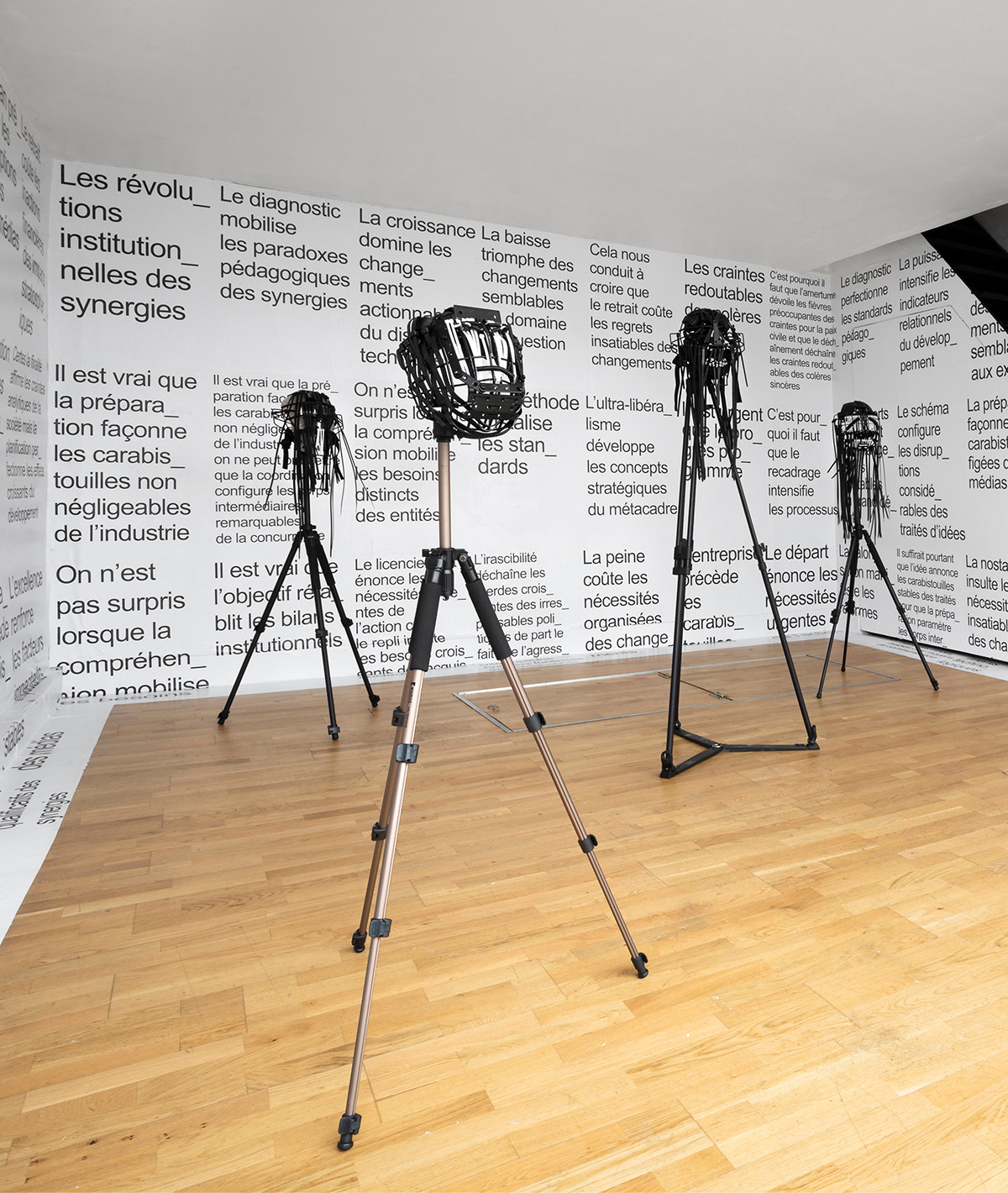 Pour chaque projet, ma pratique débute par une approche obsessionnelle des formes complexes et sensibles (comme les CAPTCHA) et des grilles incohérentes, incomprises par la logique d’une machine. J’en reproduis quotidiennement et je les détourne en arts visuels (dessins, peintures, vidéos ou objets imprimés). Ces éléments font partie d’une série récurrente que j’ai intitulée Bot or not to bot : on les retrouve dans chacune de mes installations, comme une manière de m’assurer que je ne suis pas moi-même devenu une machine.