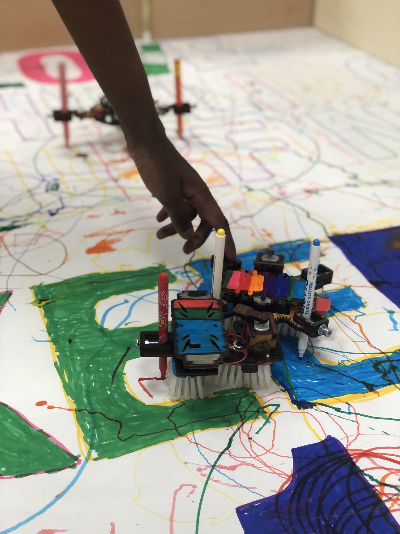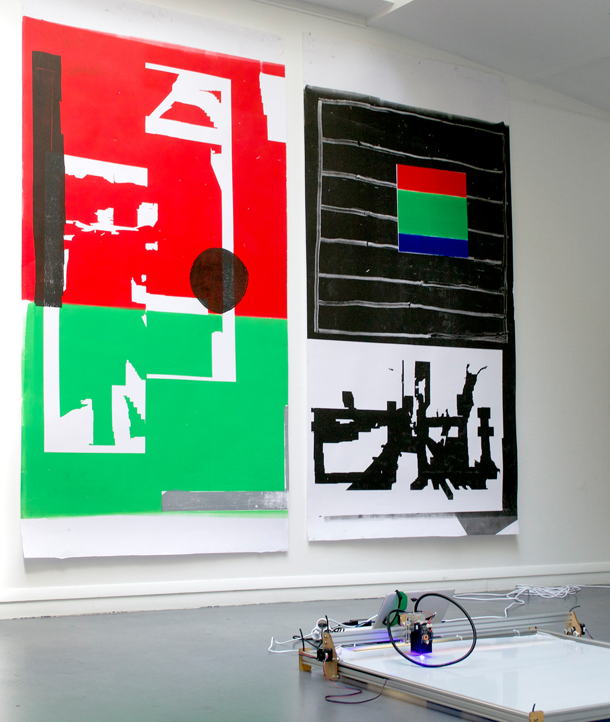 Thomas Guillemet a proposé aux élèves du collège Jules Michelet (Saint-Ouen – 93) d’explorer la Communauté des internets grâce à leur propre appartenance à cette nouvelle génération. Trois temporalités et actions se sont articulées au long du projet : un temps de recherche pour rassembler et collecter les archives des différentes mutations dans les comportements et langages, provoquées par les dernières technologies et notamment les « gestes de déconcentration » ; un second temps pour créer un nouveau médium technologique avec la conception d’une « drawing machine », robotisée qui imite le dessin humain et sa gestuelle ; un dernier temps autour de la création de masques tribaux, déjouant les grilles de reconnaissance faciale en des motifs tribaux.