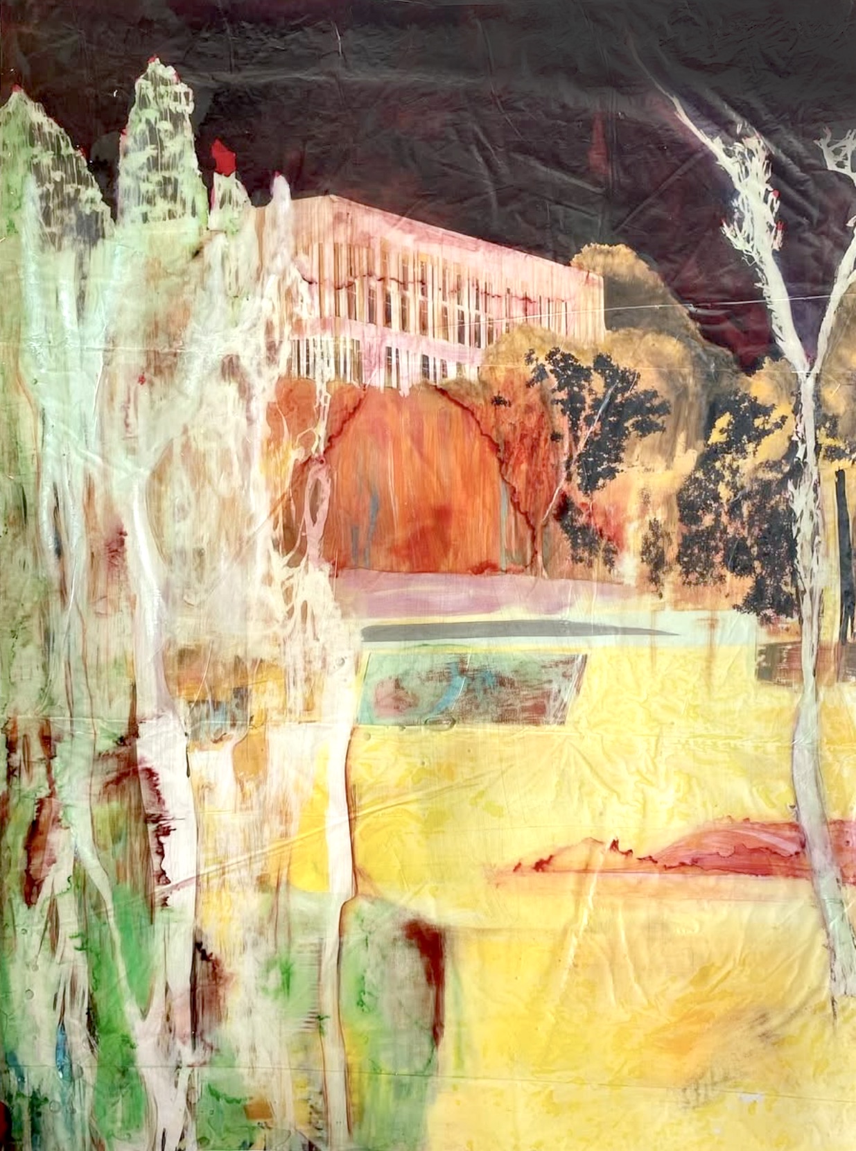 Conçu comme un exercice de disnovation, ce projet détourne l’imaginaire de l’innovation continue pour explorer une autre temporalité : celle d’un futur archaïque, où l’hyperconnexion ne produit plus seulement de la séparation, mais le désir renouvelé d’une fusion avec le milieu. Le paysage, le corps et l’interface n’y sont plus opposés ; ils se recomposent dans une même scène, à la fois tendre, machinique et sensorielle. Réalisée à quatre mains avec l’assistance d’une CNC pilotée par IA, la peinture fait cohabiter le geste lent, l’automatisation et le calcul, comme si la machine elle-même participait à une forme de retour au monde. Dans un contexte où l’ONU estime que 68 % de la population mondiale vivra en ville d’ici 2050, et où de nombreuses études montrent que l’exposition à la nature améliore stress, humeur et bien-être, l’œuvre imagine moins une fuite hors de la technique qu’une tentative de réensauvager l’expérience sensible depuis l’intérieur même des dispositifs.
