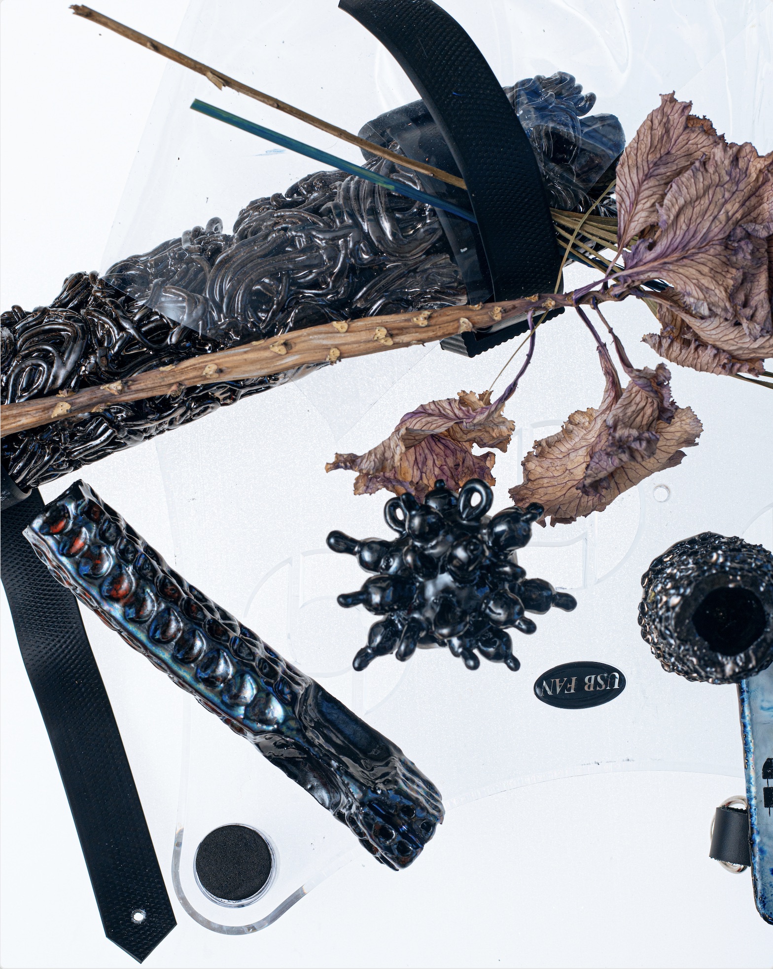 Pensé comme une archéologie chaotique du futur, ce projet met en scène des objets érotiques spéculatifs dont la charge sensuelle ne passe plus par la figure humaine, mais par des formes hybrides, techniques, végétales et tentaculaires. Il s’inscrit dans un moment où la recherche sur l’intimité avec les agents artificiels décrit déjà un déplacement du désir vers des attachements émotionnels et physiques médiés par des dispositifs non humains, tandis que les approches posthumanistes de la sexualité insistent sur le rôle actif de la matière, des objets et des artefacts dans la fabrication des subjectivités désirantes. Ici, cette mutation prend la forme de reliques à venir : fragments d’un érotisme ni organique ni machinique, mais créolisé, dévié, recomposé. Entre sextech, fossile spéculatif et interface affective, l’œuvre imagine une sensualité future qui se détache de l’anthropomorphe pour s’investir dans des présences obliques, des surfaces, des textures et des protocoles de contact encore sans nom.