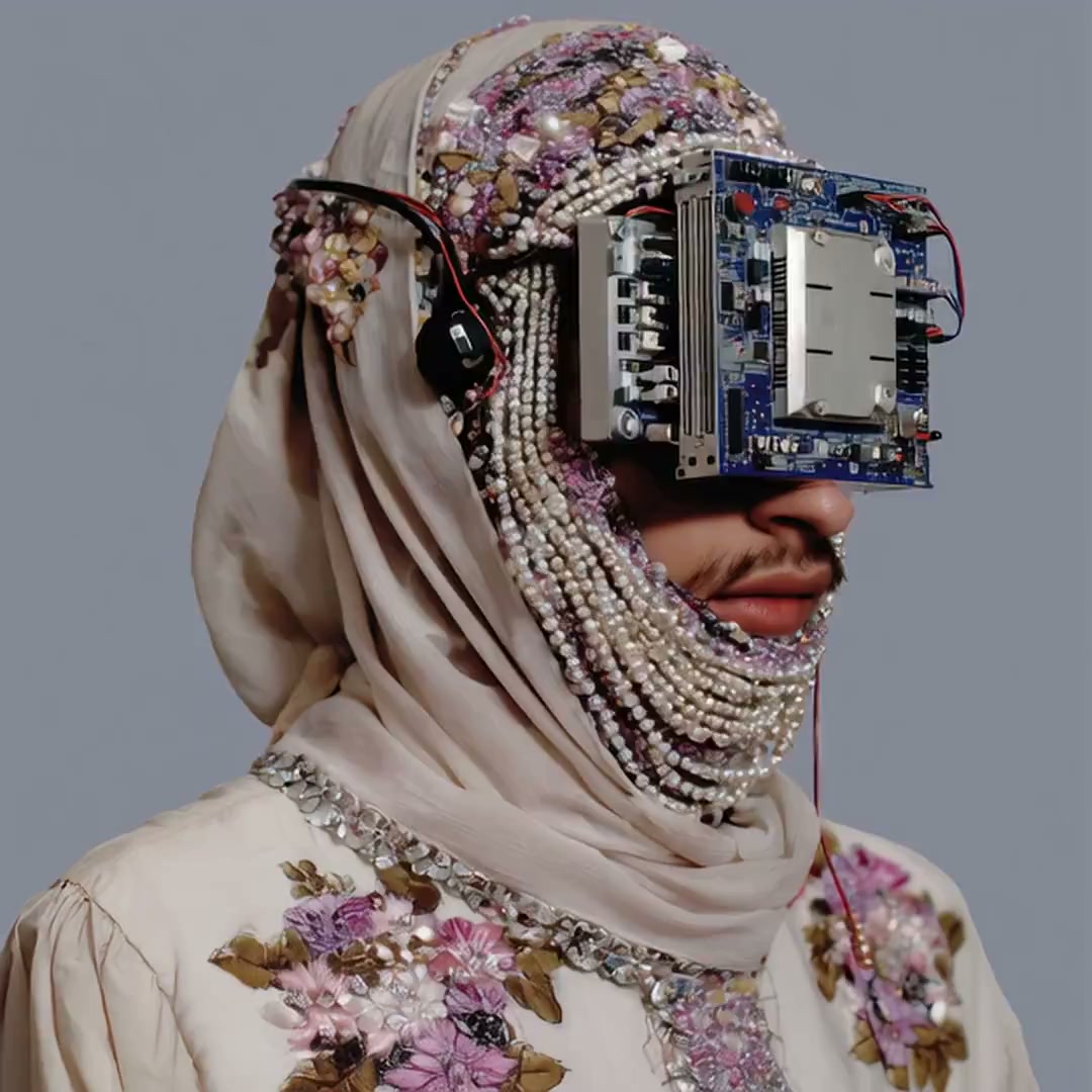 Réalisée à l’invitation de Camille Jeanjean, curatrice des nouveaux médias, dans le cadre de Arts in the Age of AI, Wearing Technologie explore les formes contemporaines d’hybridation entre corps, interface et vivant. À travers cette figure traversée par la floraison et l’optique, l’œuvre imagine une technologie moins portée qu’incorporée, devenue membrane sensible entre perception, environnement et transformation.