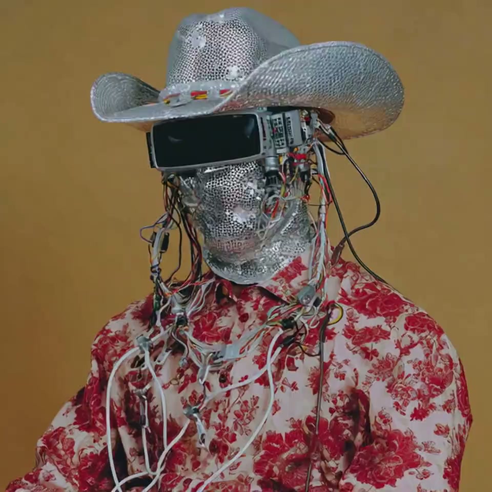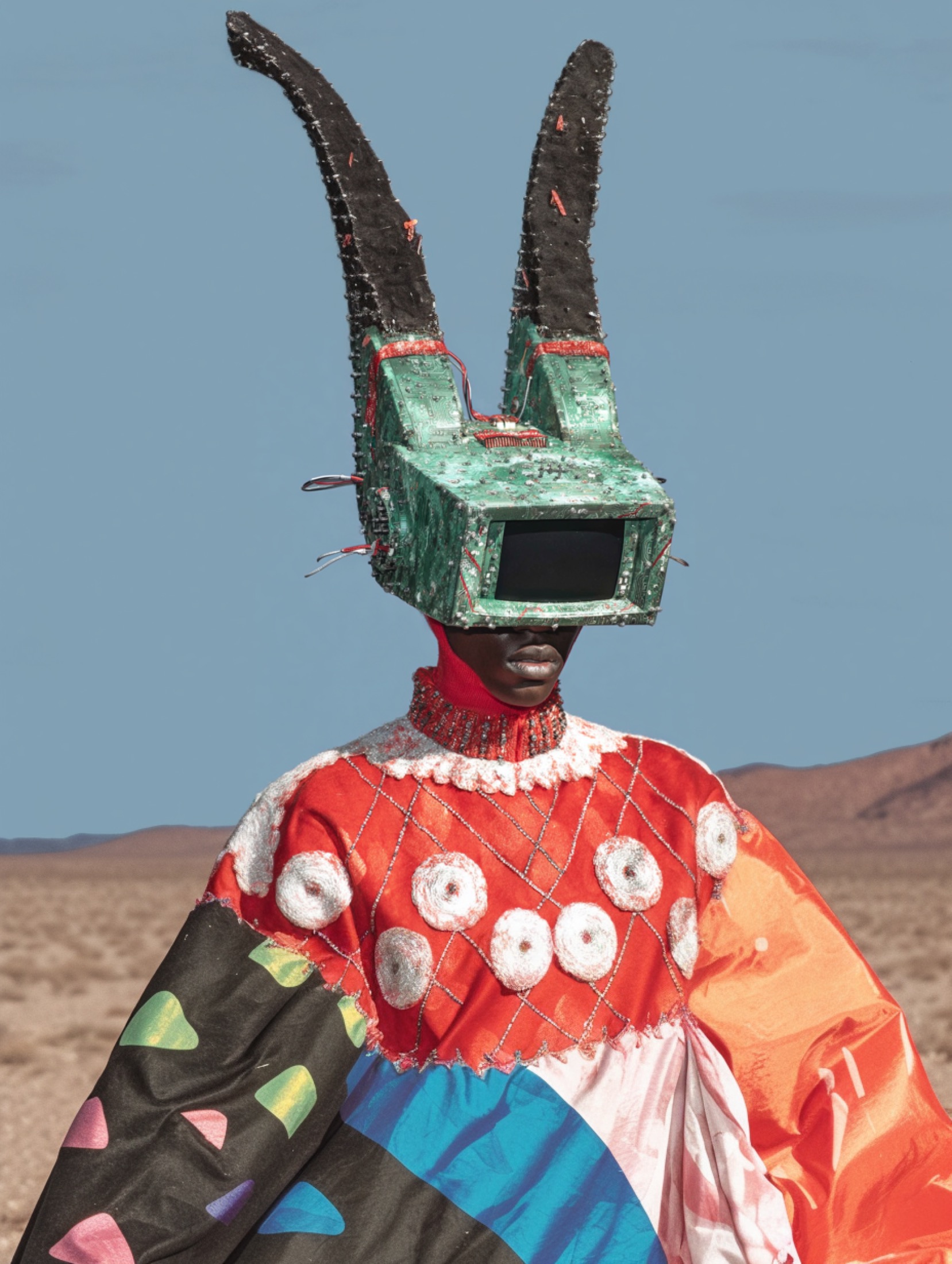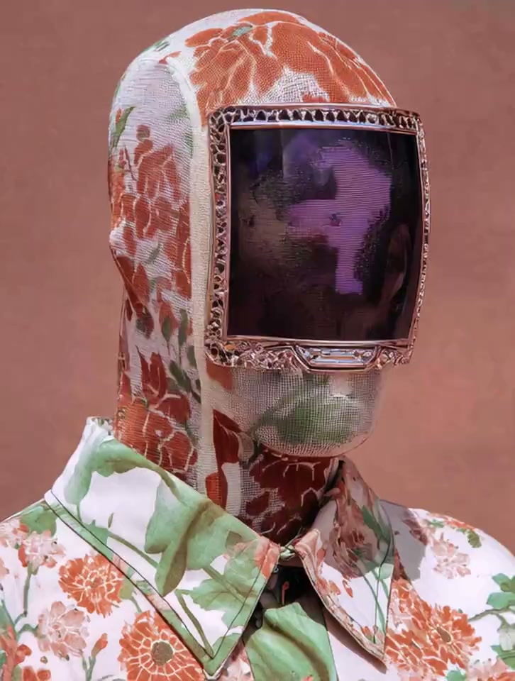 À travers ces figures masquées, l’œuvre transforme les dispositifs électroniques de vision, de calcul et de capture en objets de parure quasi rituels. Entre masque cérémoniel, interface et sculpture portable, ces formes interrogent la manière dont les technologies contemporaines redessinent le visage, non plus seulement comme lieu d’identité, mais comme surface d’inscription symbolique, de surveillance et de fiction.