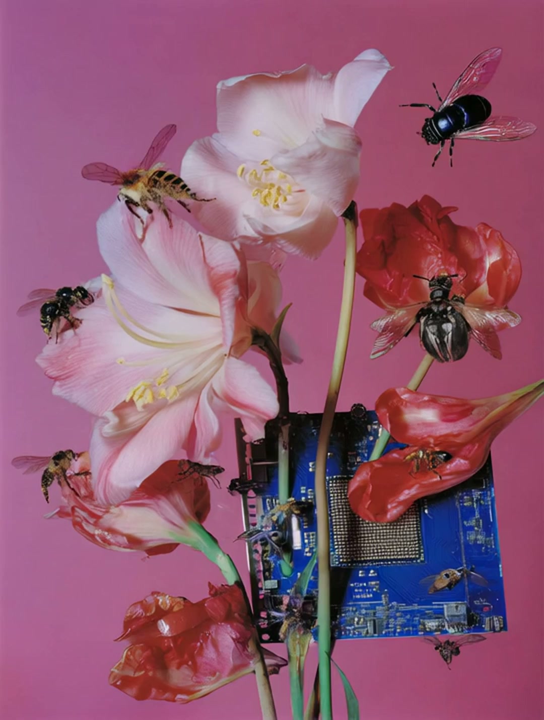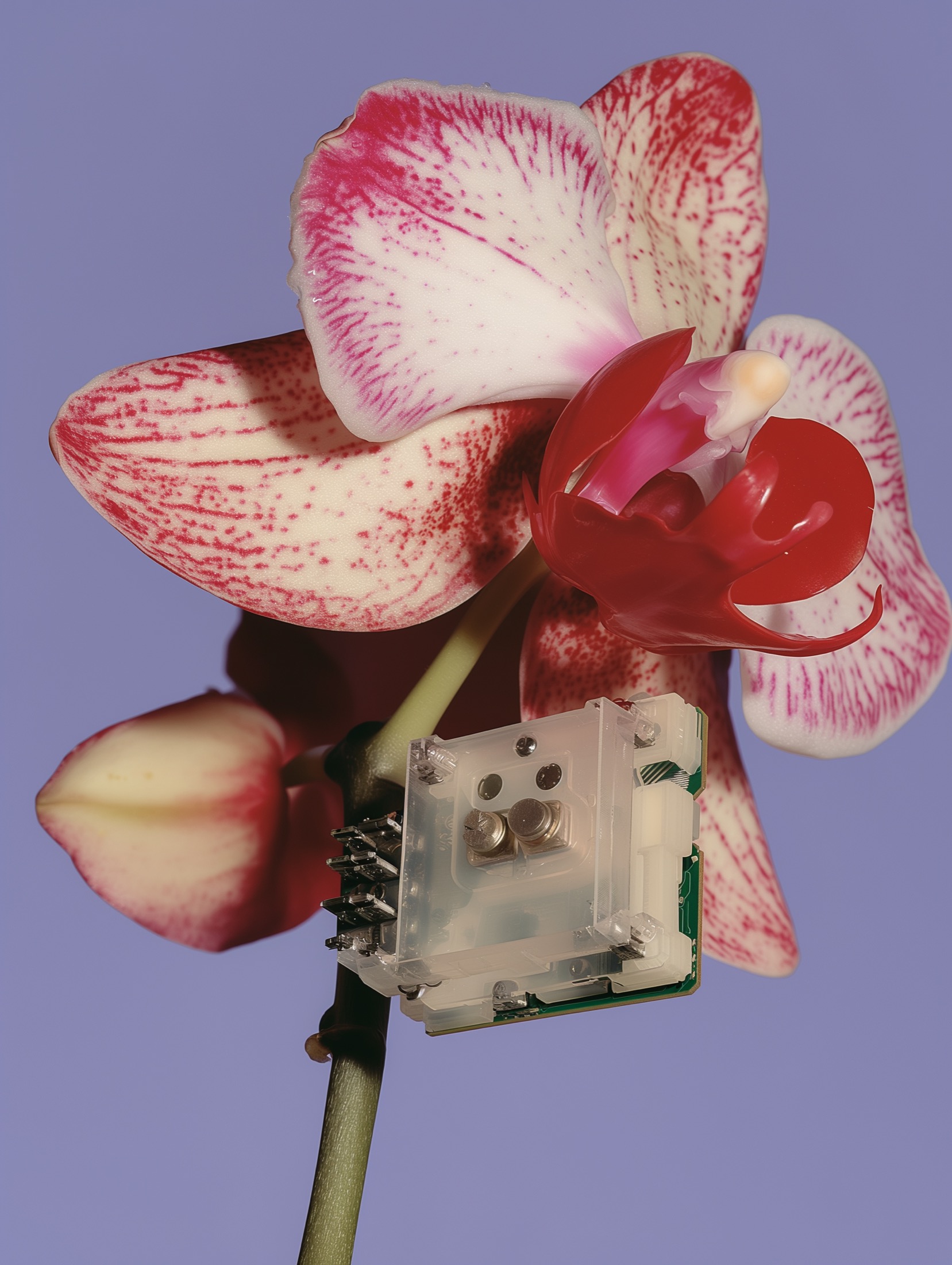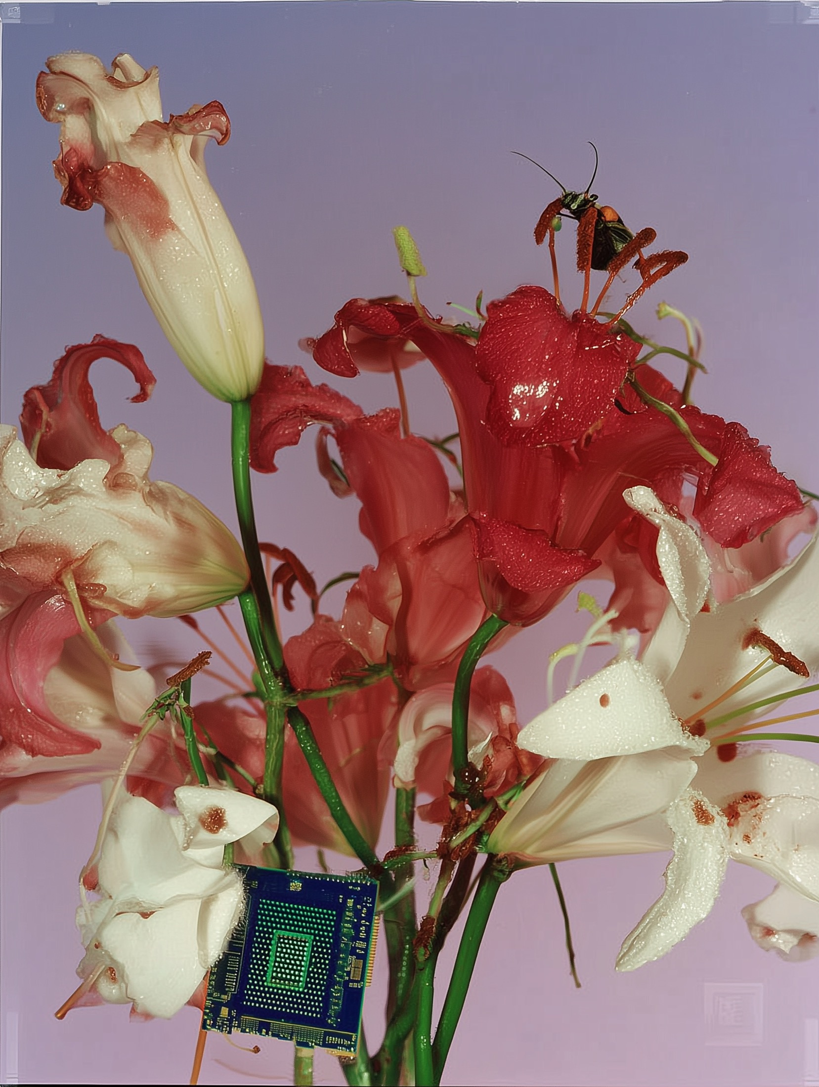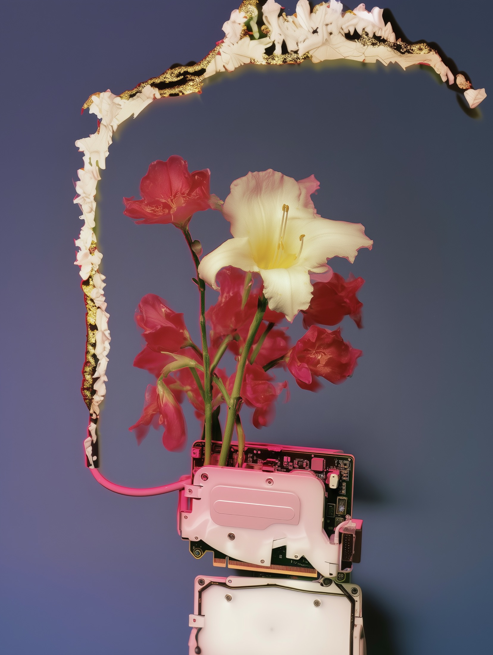 À l’heure où les data centers pourraient atteindre environ 945 TWh de consommation électrique annuelle d’ici 2030, et où le refroidissement peut représenter jusqu’à 40 % de l’énergie d’un centre de données, l’œuvre imagine un végétal qui n’évolue plus hors de l’infrastructure, mais à l’intérieur de ses flux thermiques, liquides et computationnels. Le recours au liquid cooling, dont les liquides peuvent transférer la chaleur jusqu’à 1 000 fois plus efficacement que l’air, devient ici une fiction de survie autant qu’un motif plastique. Face à un monde où l’on recense environ 391 000 espèces de plantes vasculaires, et dont une part croissante est menacée, cette image propose la figure spéculative d’une flore qui se maintient en mutant, en se créolisant avec la machine. Réalisée à partir de photographie augmentée, de composition numérique et de dépose pigmentaire par traceur hacké, elle donne forme à une écologie de seuil, où la fleur devient interface, la sève un circuit, et la croissance un protocole.