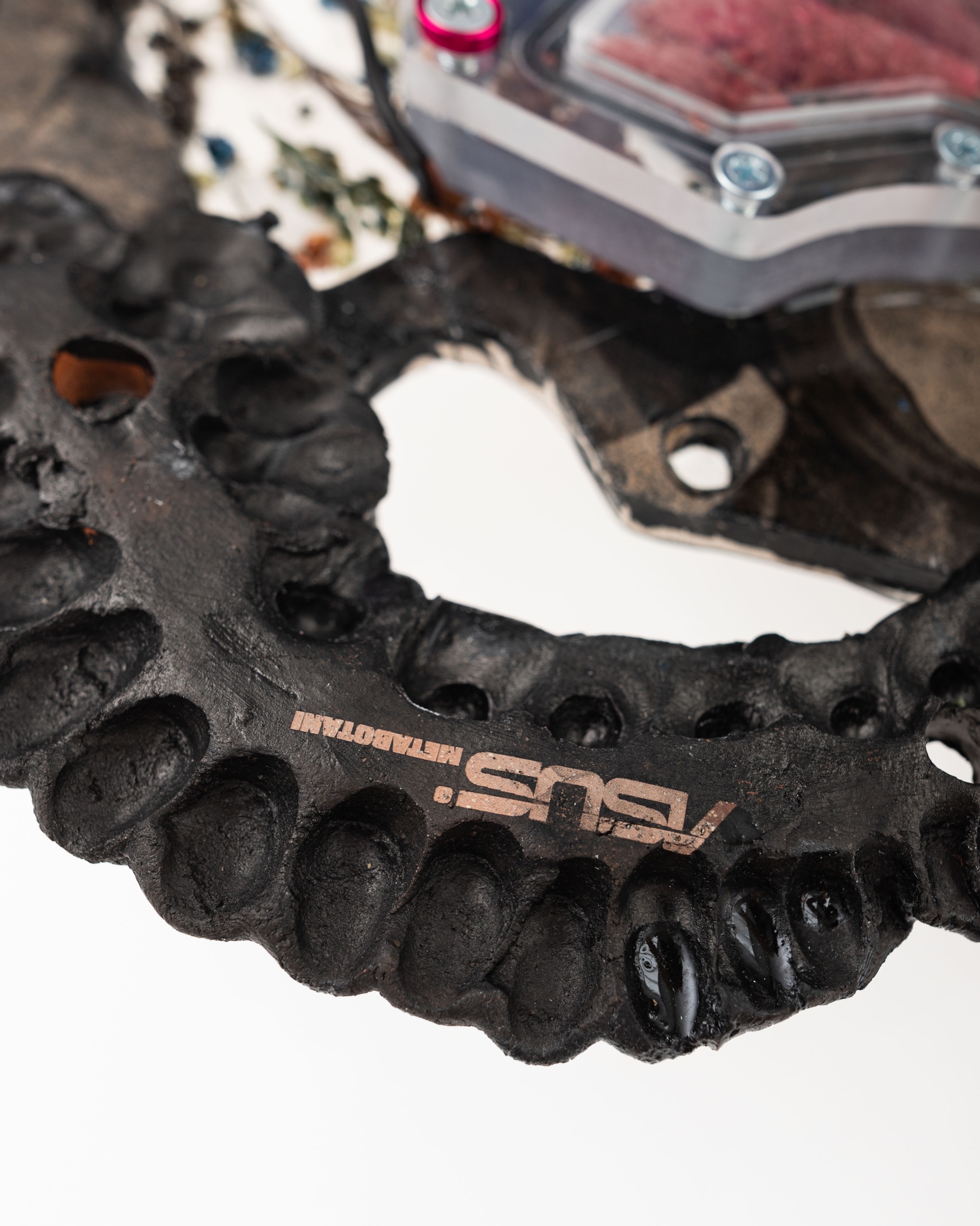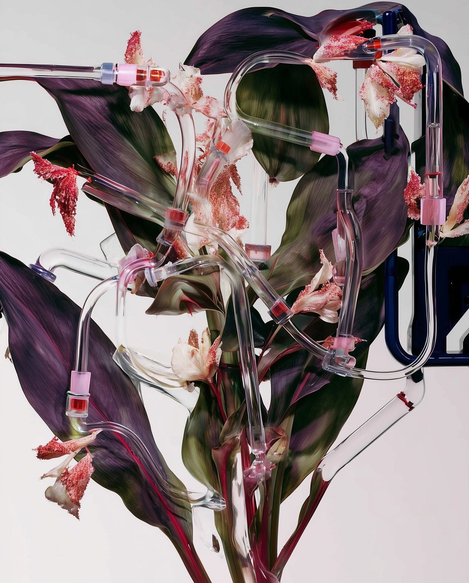 Cette série propose une vision spéculative d’un végétal à venir, transformé par son contact prolongé avec les systèmes techniques. À mesure qu’il cohabite avec la machine, l’organique y mute, s’adapte et se créolise, comme s’il développait ses propres stratégies de survie au sein d’un nouvel environnement techno-biologique. Réalisée à partir d’un processus mêlant photographie et peinture augmentée, l’œuvre mobilise un traceur hacké permettant au pigment d’être déposé comme une véritable matière picturale. Entre image construite, surface peinte et fiction botanique, elle esquisse un devenir hybride du vivant, où la floraison elle-même semble désormais commandée par une forme de moteur.