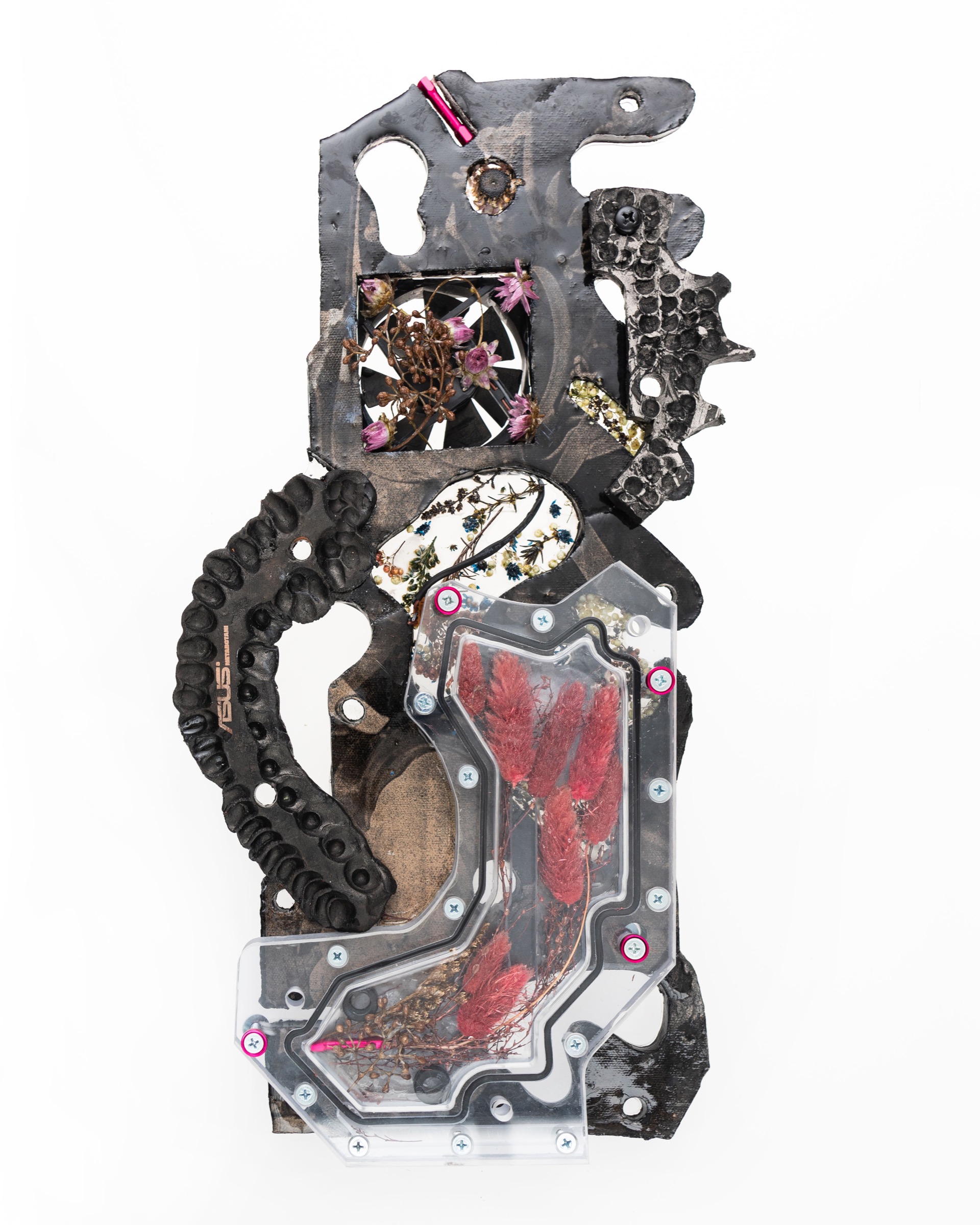 Inspirée par l’univers du PC modding et des systèmes de watercooling, l’œuvre transpose les logiques de circulation, de refroidissement et de maintenance des machines vers le champ du vivant végétal. Waterblocks dessinés par l’artiste, céramique, éléments organiques, ventilation et matériaux transparents composent une structure hybride, à la fois chambre d’incubation, reliquaire technique et prototype spéculatif. À travers cette rencontre entre hardware et formes du vivant, elle interroge les conditions contemporaines de cohabitation, de soin et de dépendance entre organisme et infrastructure.