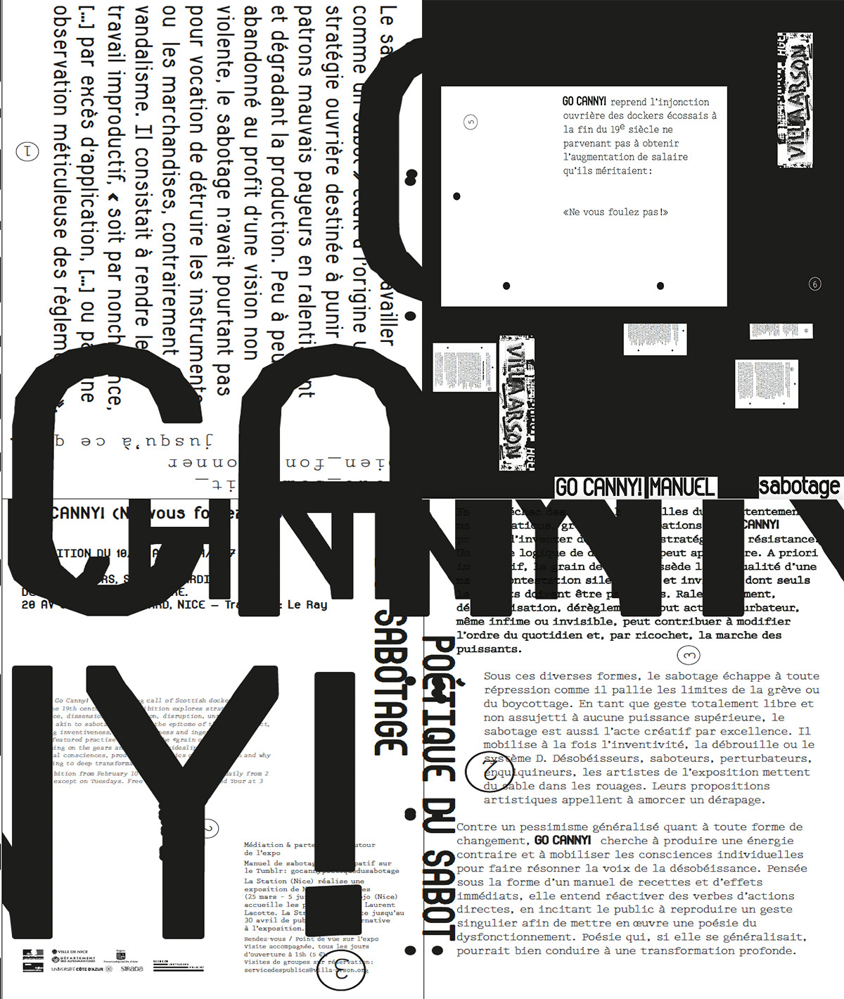 Dans le cadre de l’exposition GO CANNY! Poétique du sabotage à la Villa Arson, j’ai également été en charge de la direction artistique de cette exposition. Ma proposition et démarche artistique a été de pleinement saboter la communication visuelle. Ainsi, l’identité graphique et le catalogue ont été sabotés, rendant très complexe l’identification et la lisibilité de l’exposition.