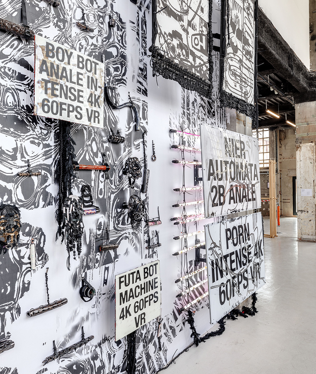 Cette installation, présentée au Salon de Montrouge à l’occasion de sa 65e édition, s’inscrit dans le prolongement de Il faudrait que je cessasse de vivre pour cesser de vous aimer et se pense comme une cartographie des mutations du désir érotique et du Néoporno. Elle observe l’essor des sextoys robotisés, ainsi que l’érotisation non plus de la machine anthropomorphe mais de formes mécaniques nous éloignant au maximum d’une apparence humaine. L’installation mobilise également une intelligence artificielle capable d’entrer en discussion avec le visiteur par SMS et de lui répondre par un message singulier associé à une composition appelée « nudes ».