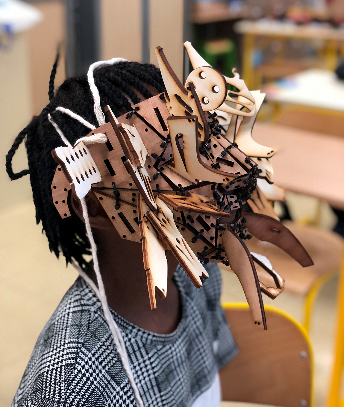 Thomas Guillemet a proposé aux élèves du collège Jules Michelet (Saint-Ouen – 93) d’explorer la Communauté des internets grâce à leur propre appartenance à cette nouvelle génération. Trois temporalités et actions se sont articulées au long du projet : un temps de recherche pour rassembler et collecter les archives des différentes mutations dans les comportements et langages, provoquées par les dernières technologies et notamment les « gestes de déconcentration » ; un second temps pour créer un nouveau médium technologique avec la conception d’une « drawing machine », robotisée qui imite le dessin humain et sa gestuelle ; un dernier temps autour de la création de masques tribaux, déjouant les grilles de reconnaissance faciale en des motifs tribaux.