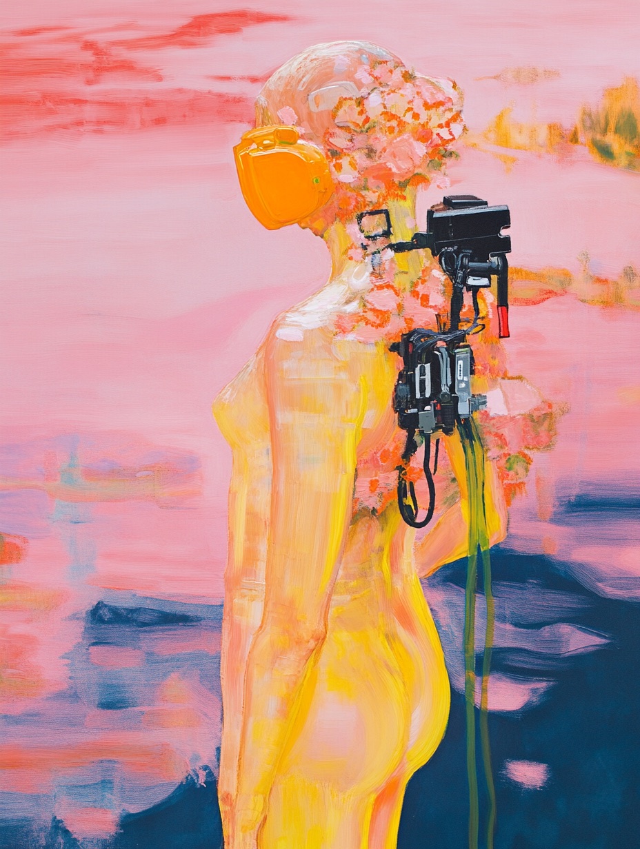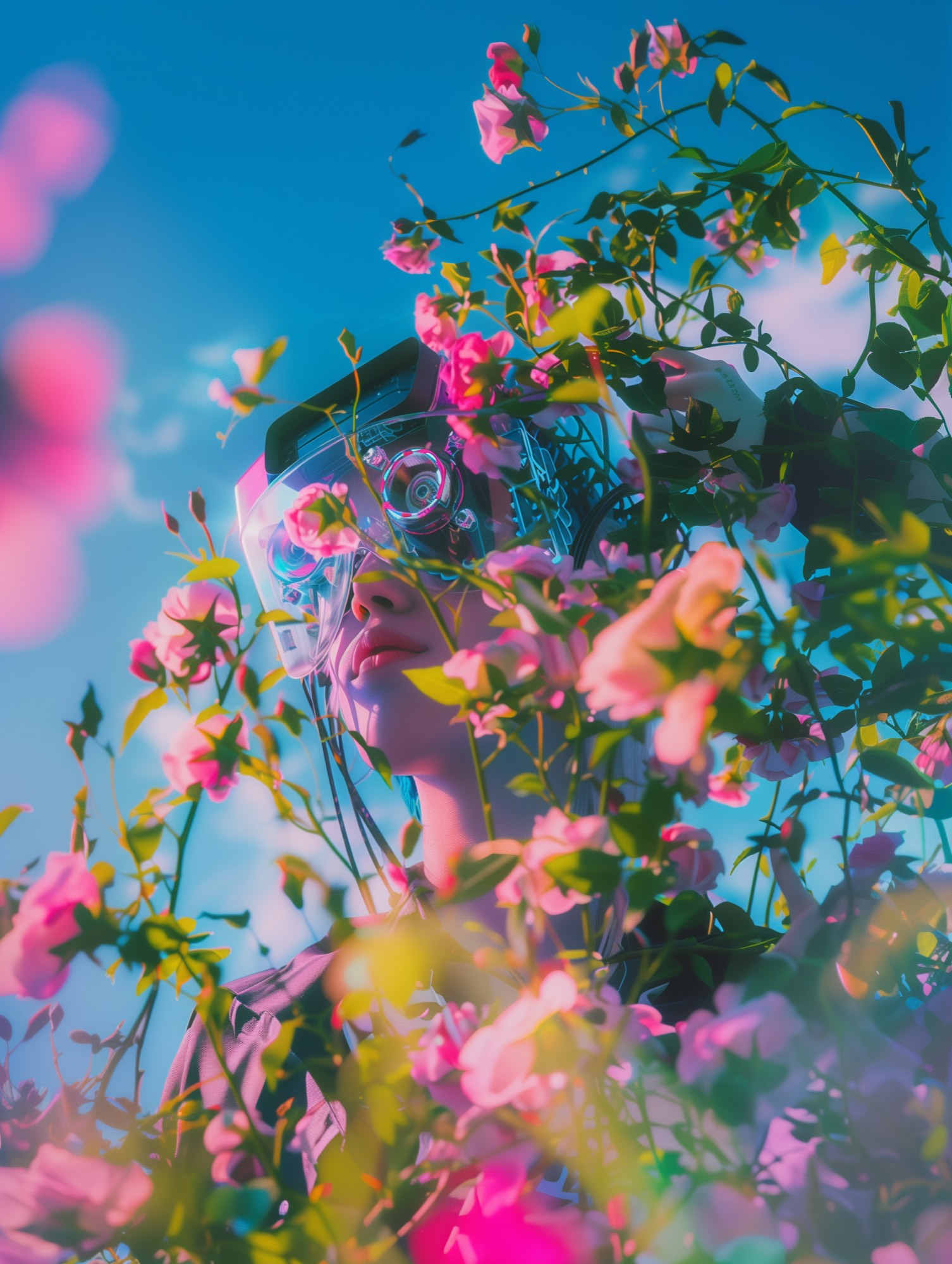 Réalisée à l’invitation de Camille Jeanjean, curatrice des nouveaux médias, dans le cadre de Arts in the Age of AI, Wearing Technologie explore les formes contemporaines d’hybridation entre corps, interface et vivant. À travers cette figure traversée par la floraison et l’optique, l’œuvre imagine une technologie moins portée qu’incorporée, devenue membrane sensible entre perception, environnement et transformation.